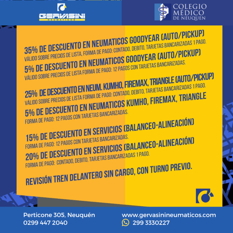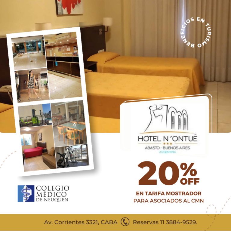 ![]() | Hotel N’Ontué20% de descuento en Tarifa Mostrador para asociados al Colegio Médico de Neuquén. Av. Corrientes 3321, CABA Reservas: 11 3884-9529 |